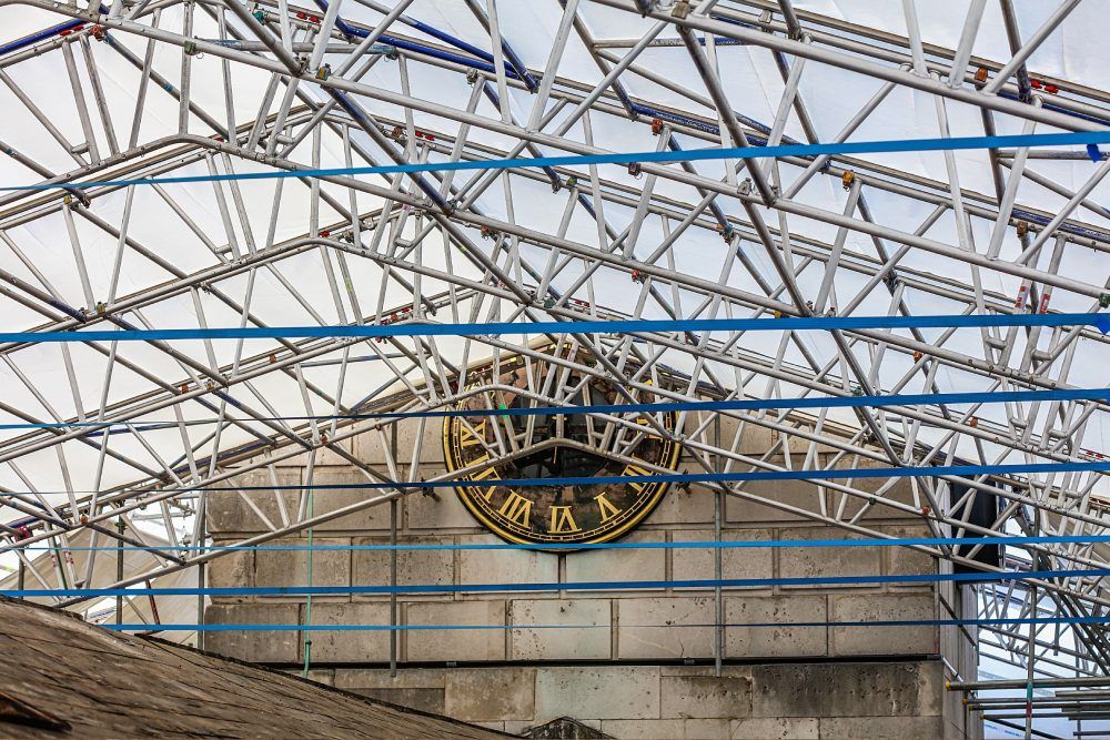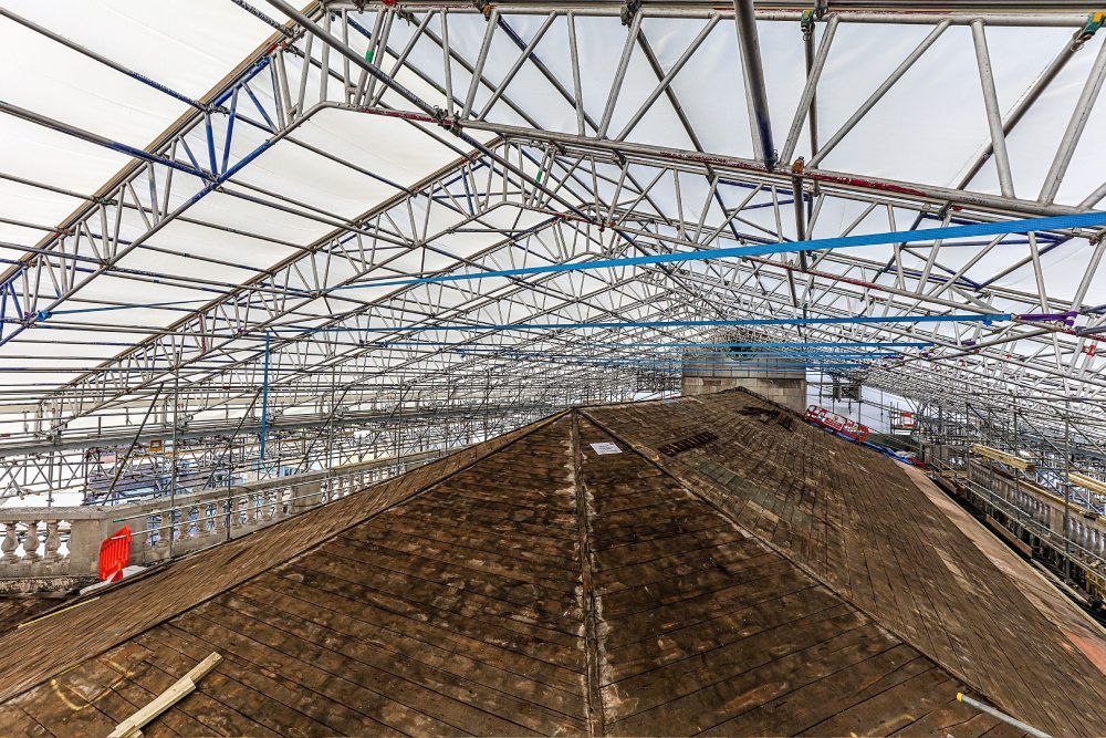 The temporary roof was erected by hand as there was no access for a crane. To do this, platforms were built either side of the church tower and the roof was built section by section. The roof consisted of 17m x 2.5m bays and a 28m dual pitch span. All 17 bays were rolled into position on the track system. The temporary roof was also constructed with a full gutter system for water management. PHD also provided the hoist and hoist runoff.